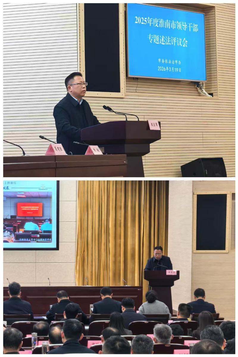 2026年3月19日下午,2025年度淮南市领导干部专题述法评议会在市政务中心举行。市商务局党组书记、局长孙道军就履行法治建设第一责任人职责情况进行专题述法,现场接受评议组问询、点评及量化测评,综合得分位列现场述法单位第二名。