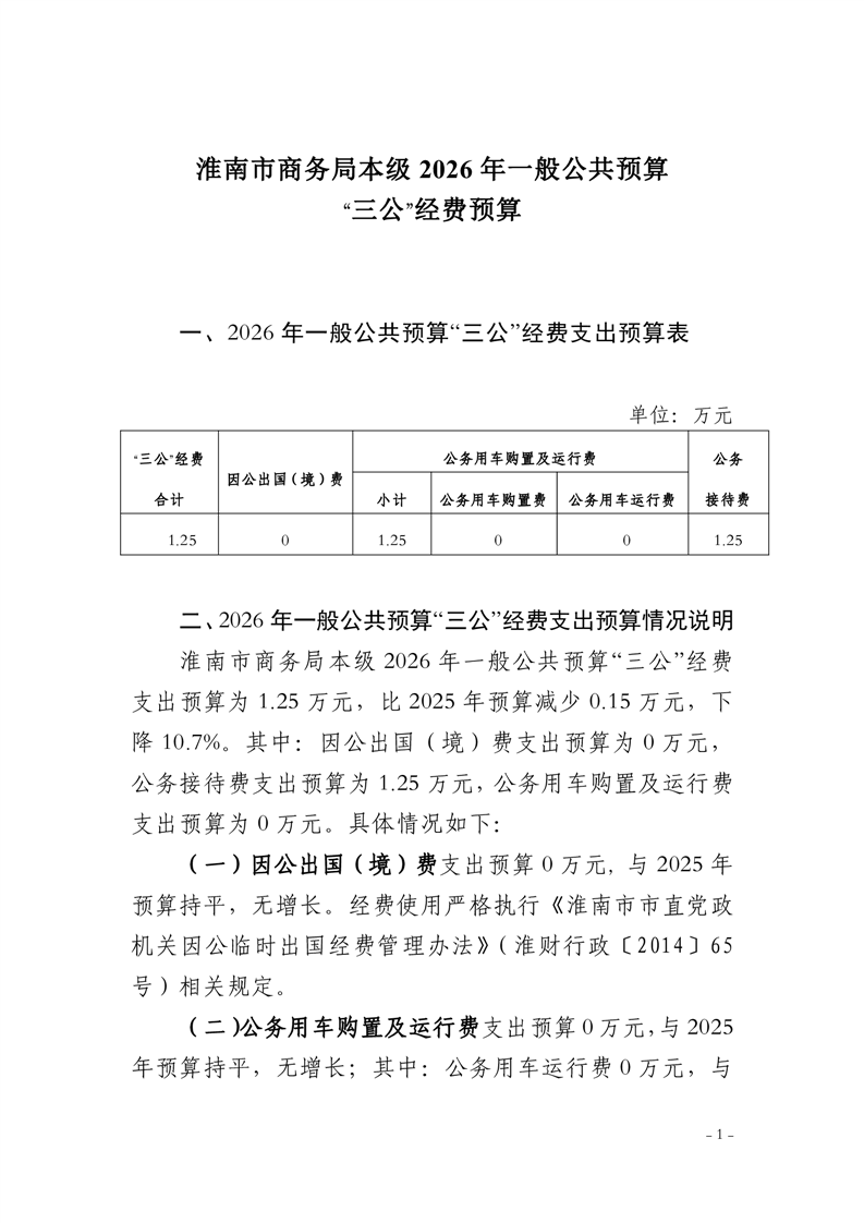 淮南市商务局本级2026年一般公共预算“三公”经费预算